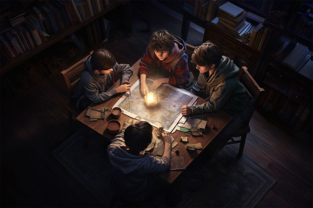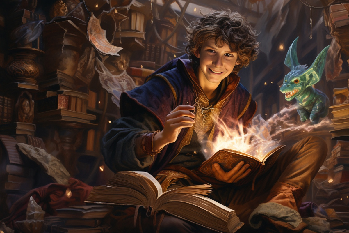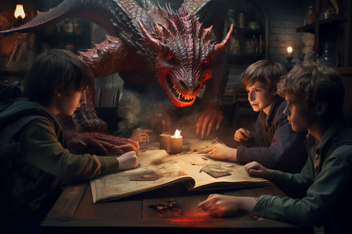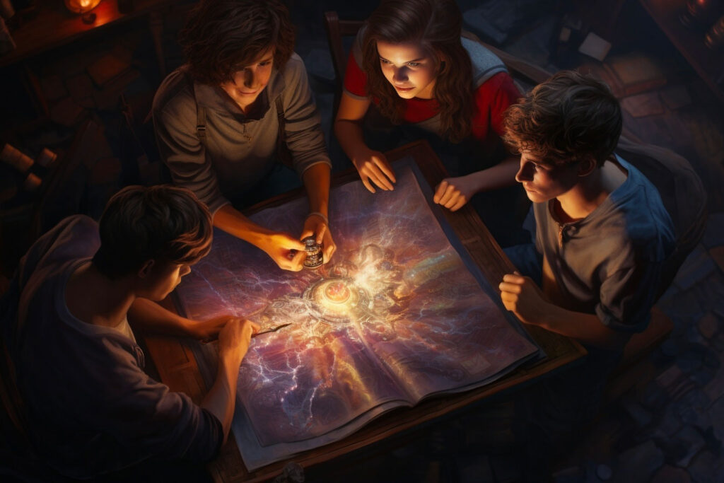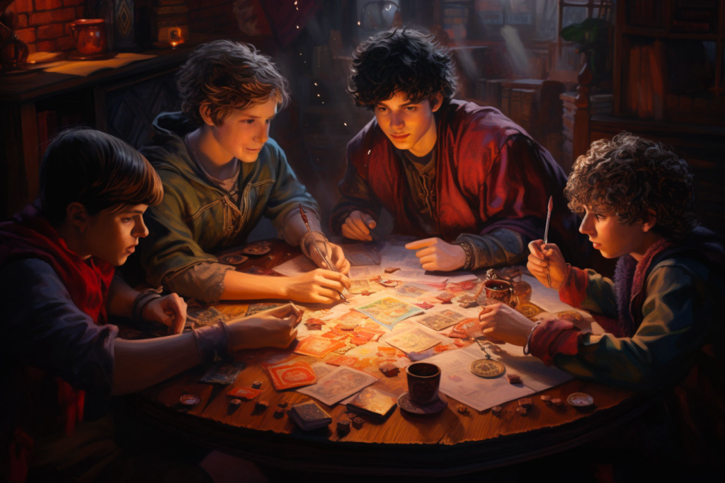 The library shimmered, the walls shifting into a glowing tableau of a group of players gathered around a table. Dice clattered, papers rustled, and a Dungeon Master’s screen stood tall at the center. Peter and Calliope found themselves amidst this scene, the air thick with the energy of imagination.
