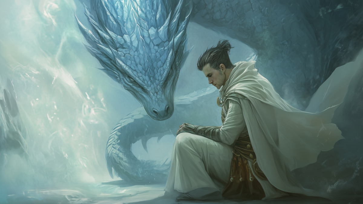 A shimmering image of a platinum dragon appeared, its majestic form radiating light. “Introduced in the first edition of Advanced Dungeons & Dragons,” Peter began, “Bahamut, the Platinum Dragon, is the King of the Good Dragons—a deity of good dragonkind. For me, Bahamut represented a deeper connection to the divine within the game.”